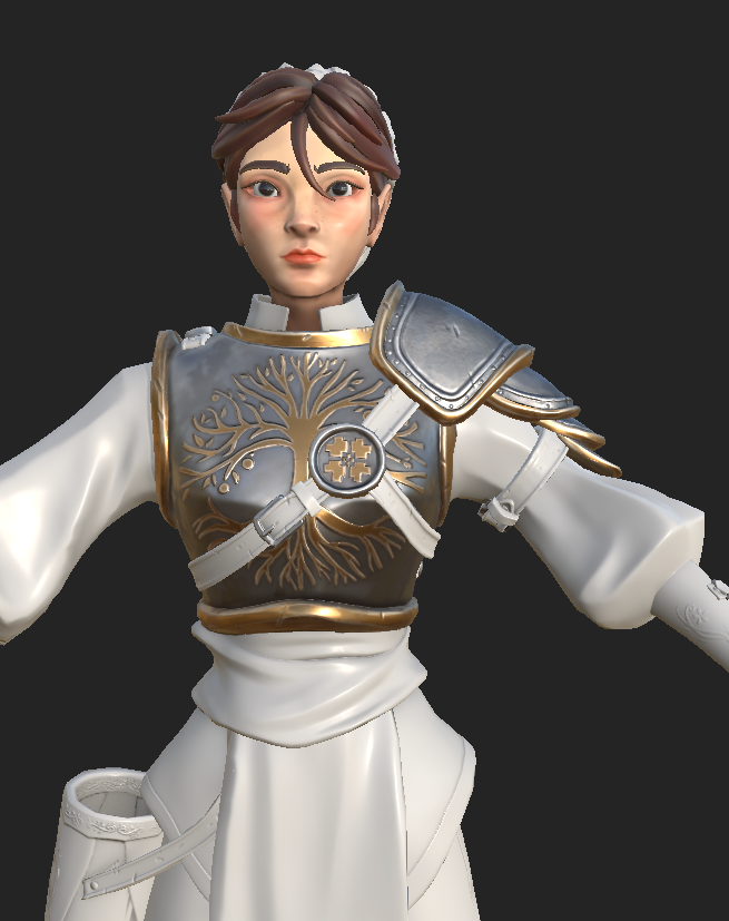 I painted the patterns on the leather braces and quiver gold, as I thought it would be a nice detail and a nice contrast to the dark leather. I had to turn the metalness up a bit though, as the colour didn't reflect the light in the way this type of shimmery gold paint placed on top of leather would in real life.